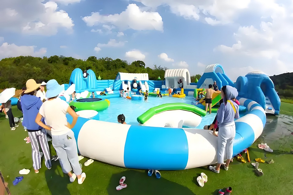 1、大型充气玩具:采用高强度PVC夹网布材质,定制大象、城堡等趣味造型,适用于商业活动与临时水上乐园。